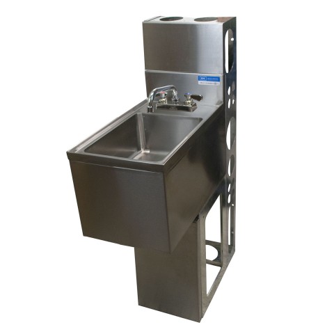 Underbar Dump Sink, 14-1/2"W x 18-1/4"D x 33-1/2"H overall size, 10" wide x 14" front-to-back x 6" deep bowl, 4" OC splash mount lead-free faucet (BKF-W2-6-G), 18/304 stainless steel top, die wall and base, NSF