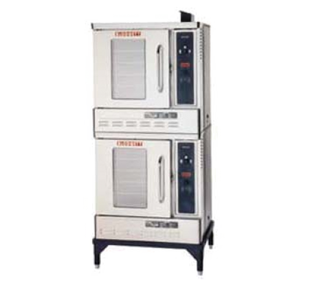 Convection Oven, gas, half-size, double-deck, capacity (5) 13" x 18" pans per compartment, (SSM) solid state infinite controls with separate dials for thermostat and timer, 1-speed fans, interior light, single door per deck with dual pane thermal glass, stainless steel front, sides & top, 7" stainless steel stand, 1/2 HP, 27,500 BTU per section, cETLus, NSF