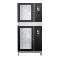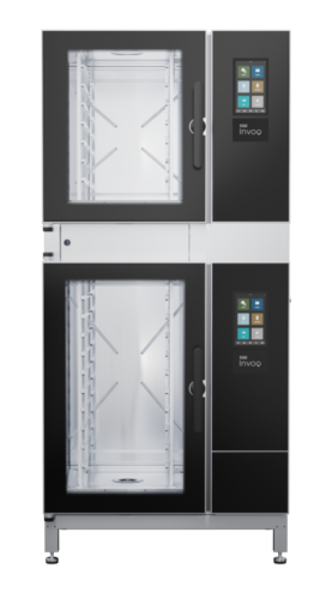 Blodgett INVOQ Model No. 61BE/61BE-PT, Combi Oven Steamer, Electric, boiler, Pass-thru, 61BE-PT stacked on 61BE-PT, (10) 12" x 20" hotel pan capacity or (5) + (5) full size 18" x 26" sheet pan capacity (using MultiRack option), Stacking kit included, (2) + (2) side racks with non-tilt support rails, (5) + (5) wire shelves, touch screen controls, multiple cooking modes, SmartChef, MenuPlanner, CombiSpeed/CombiSense, stores up to 1,500 recipes, built-in hand shower, HybridSteam: Injection Steam & Boiler Steam, external temperature probe, Delta‐T cooking, Cook & Hold, USB port, Cloud Connectivity (optional), HACCP, CareCycle Tablet-based automatic cleaning system, heat protection with triple‐pane glass door, stainless steel exterior & interior, cULus, NSF, CE, ENERGY STAR®