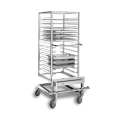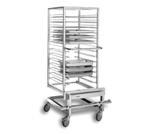 Transport Cart, stainless steel, (wire shelves not included), holds standard 26-position rack guides or universal rack guides, holds up to (14) 18" x 26" bake pans on wire shelves or (28) 12" x 20" x 2.5" steam table pan capacity, locking pan stop, drip pan, removable cart handle, 304 stainless steel construction, 5" heavy duty casters, (for use with BC-20 E/G only)