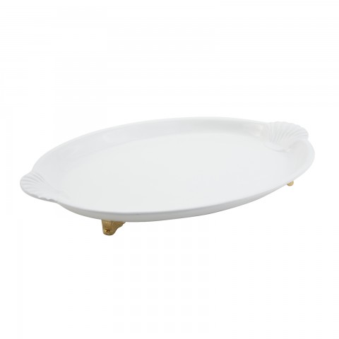 Platter, 18" x 24-3/4", with shell handles, with 4 brass legs, aluminum with ceramic-look coating, Sandstone, Matte Dark Gray