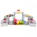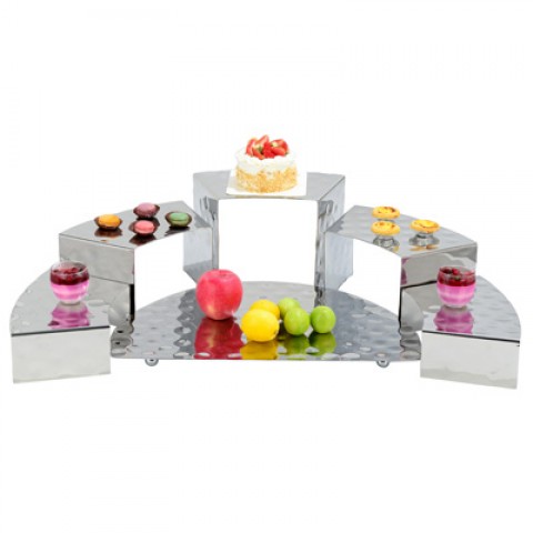 Display Riser Set, 6-piece, includes: (1) 12"W x 7"D x 8-1/2"H shelf, (2) 12"W x 7"D x 6-1/4"H shelves, (2) 12"W x 7"D x 4"H shelves, (1) 21-1/2"W x 13-3/4"D x 1/2"H base, hammered finish, 18/8 stainless steel