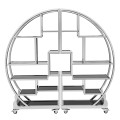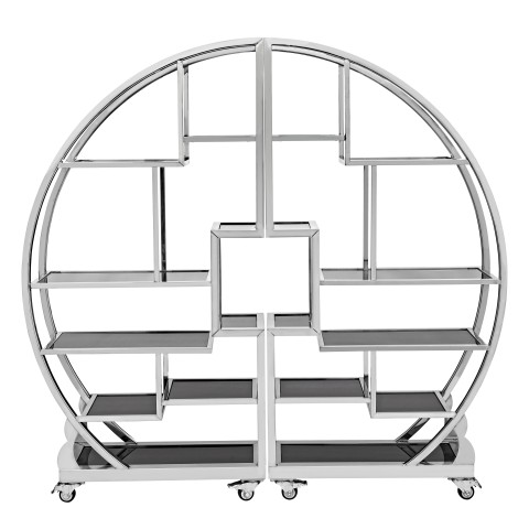 Mobile Buffet Tower, 2-piece set, 72"W x 14"D x 70-1/4"H, circular shape, (16) removable glass shelves (8 each side), stainless steel frame, 2-1/2" dia. locking casters