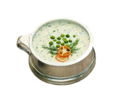 Soup Bowl, 18 oz., 5-1/8" dia. (6-1/4" x 2-1/2"H O.A.), with side ring handle, aluminum with ceramic-look coating, Sandstone, Ivory