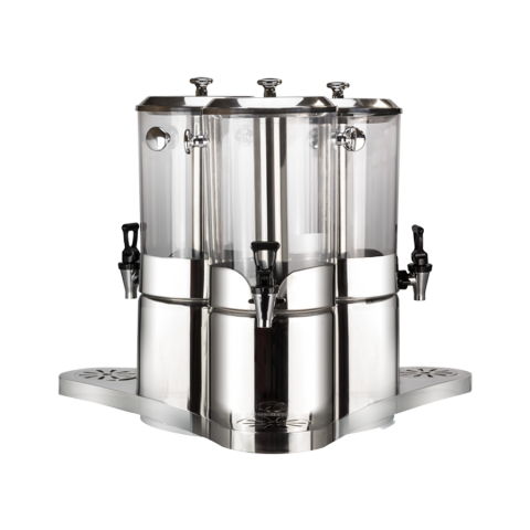 Juice Dispenser, triple, (3) 2 gallon each cylinder, 26-1/2" x 26-1/2" x x 22"H O.A., round, rotating, stainless steel ice chamber, stainless steel base