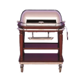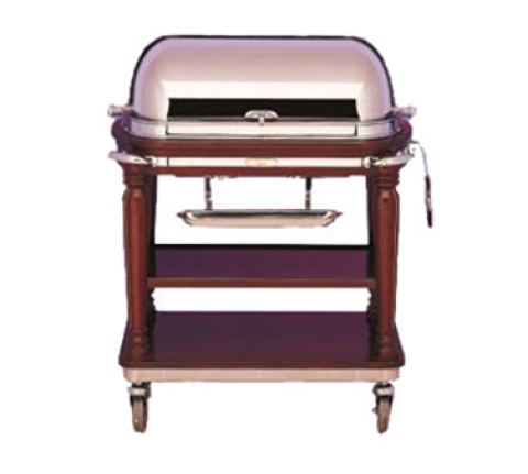 Roast Beef Trolley, 42" x 23-1/2" x 42-1/2" H, mahogany body, hotel weight, stainless steel fully roll back cover with vent holes & locking handle, stainless steel corner handles, knife tray & plate holder, carving board, stainless steel drop-in containers & water pan