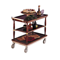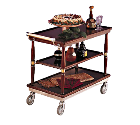 Guerridon Classic Trolley, 37-1/2" x 19-1/2" x 31-1/2" H, mahogany finish, hardwood body, three wooden shelves, stainless steel swivel casters, stainless steel & brass handle