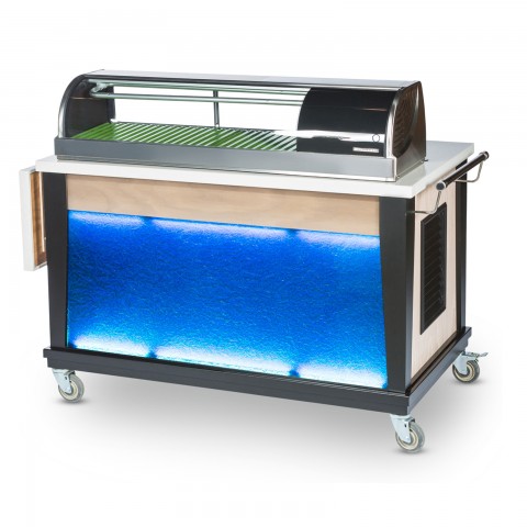 Sushi Cart, 54-1/2"L x 30"W x 45"H, solid surface counter top with solid surface drop leaf, 48" curved glass refrigerated sushi display case, back-lit front textured blue acrylic panel, 4" heavy duty non-marking casters, (2) locking, (2) non-locking, 120v/60/1-ph, 13 amps, NEMA L5-20P