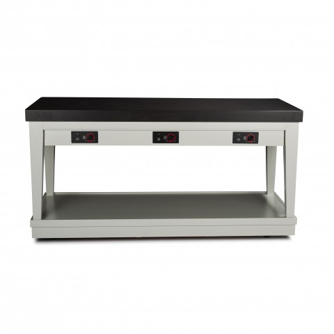 Suprastone Mobile Hidden Induction Action Table, 72"W x 30"D x 36"H, solid 3" Suprastone countertop, includes: (3) hidden 1800 watt induction stoves with infinite controls to cook or hold (12083), flip-up control panel, 4" casters, brushed stainless steel/laminate base, 120v/60/1-ph, 45 amps, NEMA (1) L5-20 plug, (1) L5-30 plug