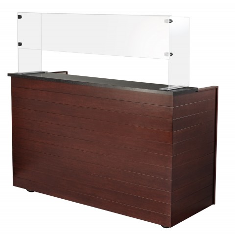 Mobile Liquor Bar, 72L x 27"W x 48"H O.A., plank style design, wood exterior, standard quartz countertop, insulated cold pan with drain, well opening 19-7/8" x 11-3/4" x 9-3/4" I.D., flange: 24" x 16" O.A., for (1) 12" x 20" pan, stainless steel counter top and back splash, (1) stainless steel speed rail, (2) black high pressure laminate adjustable shelves, black high pressure laminate cabinet, (4) 5" dia. caster, (2) swivel locking, (2) rigid