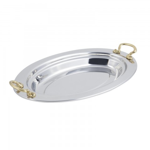 Food Pan, full oval, 2-1/2 qt. (80 oz.) capacity, 19" x 11-13/16" x 2", with round handles, plain design, stainless steel, NSF, UL
