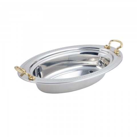 Food Pan, full oval, 6-1/8 qt. (196 oz.) capacity, 19" x 11-13/16" x 3-1/2", with round handles, heavy gauge high polished stainless steel, vapor steam lock shoulder, Bolero design, NSF, UL