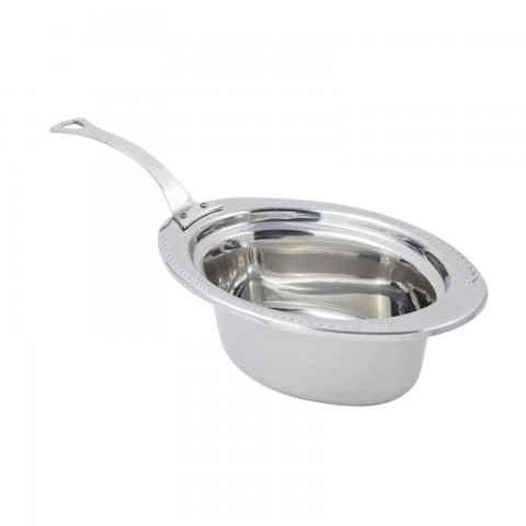 Food Pan, full oval, 3-3/4 qt. (120 oz.) capacity, 13-1/8" x 8-7/8" x 4-1/4", with long stainless steel handle, Laurel design, vapor lock shoulder, stainless steel, NSF, UL