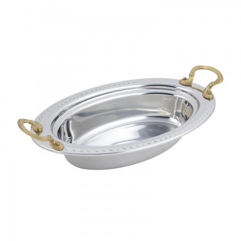 Food Pan, full oval, 6-1/8 qt. (196 oz.) capacity, 19" x 11-13/16" x 3-1/2", with round handles, heavy gauge high polished stainless steel, vapor steam lock shoulder, Laurel design, NSF, UL