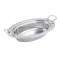 Food Pan, full oval, 6-1/8 qt. (196 oz.) capacity, 19" x 11-13/16" x 3-1/2", with round stainless steel handles, heavy gauge high polished stainless steel, vapor steam lock shoulder, Laurel design, NSF, UL