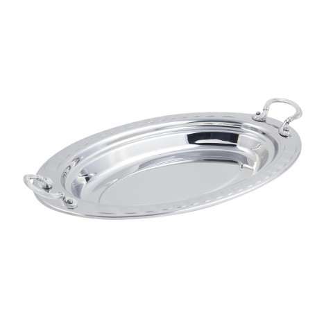 Food Pan, full oval, 2-1/2 qt. (80 oz.) capacity, 19" x 11-13/16" x 2", with round stainless steel handles, stainless steel, Arches design, NSF, UL