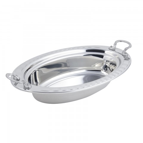 Food Pan, full oval, 6-1/8 qt. (196 oz.) capacity, 19" x 11-13/16" x 3-1/2", with round stainless steel handles, heavy gauge high polished stainless steel, vapor steam lock shoulder, Arches design, NSF, UL