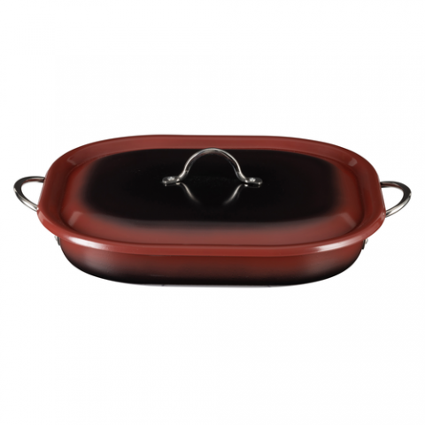 Country French X - Ombre Roasting Pan, 5 qt, 15" x 11" x 2 7/8", Oblong, With Lid, (2) 2" Round Riveted Handles, Oven & Dishwasher Safe, Induction Ready, 5 Ply, Stainless Steel, Merlot