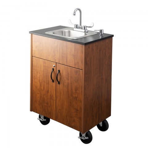 Portable Hand Washing Station, laminate cabinet, black laminate countertop, counter mount liquid soap dispenser, self contained system with (1) stainless steel sink (12"W x 10"L x 5-3/4"H), (1) 5 gallon clean water tank and (1) 6 gallon waste water tanks, water heater and pump , accommodates approximately (45) hand washes, ADA compliant wrist action faucet handles, two doors with keyless lock, (4) 5" swivel wheels (two with brakes), 110v/60/1-ph, 20 amps (dedicated outlet and breaker)