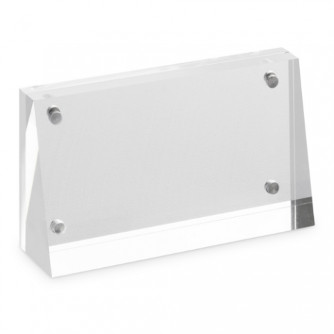 Angled Acrylic Table Sign, Magnetized, 3.5." X 2" X 1", landscape orientation