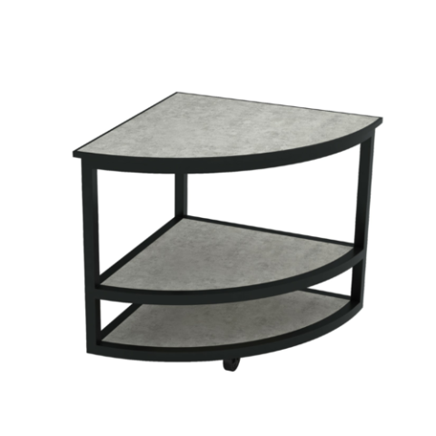 Nexus Corner Round Side Table, 31.5" x 31.5" x 33.5", with (3) exposed shelves, concrete laminate with black aluminum edge,