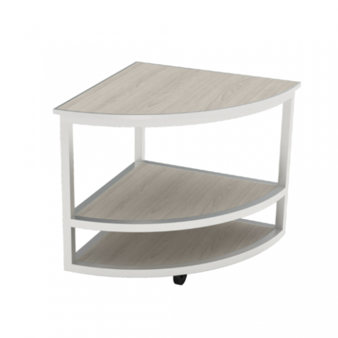 Nexus Corner Round Side Table, 31.5" x 31.5" x 33.5", with (3) exposed shelves, oak laminate with silver aluminum edge,