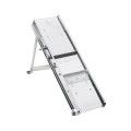 Mandoline Slicer, folded: 16-1/2"L x 5-1/2"W x 3"H, (1) serrated blade and (1) double sided julienne blade: one side with (30) teeth, 3 mm spacing and one side with (10) teeth, 10 mm spacing, 18/10 stainless steel (individually boxed)