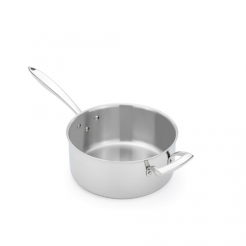 Thermalloy® Sauce Pan, 5 qt., 9" dia. x 4.3" H, without cover, stay cool hollow cast riveted handle, helper handle, operates with gas/electric/ceramic/halogen/induction, tri-ply stainless steel with aluminum core, satin finish interior, mirror finish exterior, NSF (cash & carry packaging)