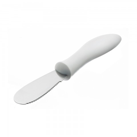 InnovaTools® Butter Spreader, 8-3/10" OAL, 3-1/2"L x 1-3/10"W German carbon steel blade (heat treated & tempered), serrated, 5" dual texture ergonomic white nylon handle (heat resistant to 446° F (230° C), dishwasher safe, NSF (cash & carry packaging)