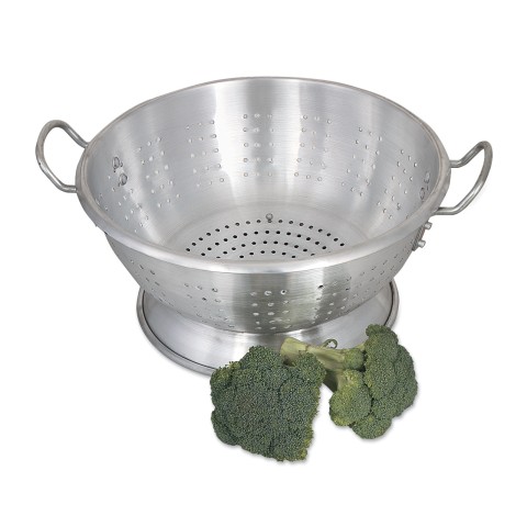 Colander, 10.4 qt., 15" dia. x 5-3/4" deep, 3/16" holes, riveted handles, rounded edges, stand alone base, 3.0 mm thickness, heavy-duty, aluminum