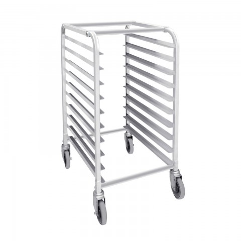 Bun Pan Rack, holds (10) full sheet pans, 26" x 20-1/4" x 44-1/2"H overall, rail ledges, 3" (7.62cm) vertical spacing, 6" casters, aluminum (ships unassembled)