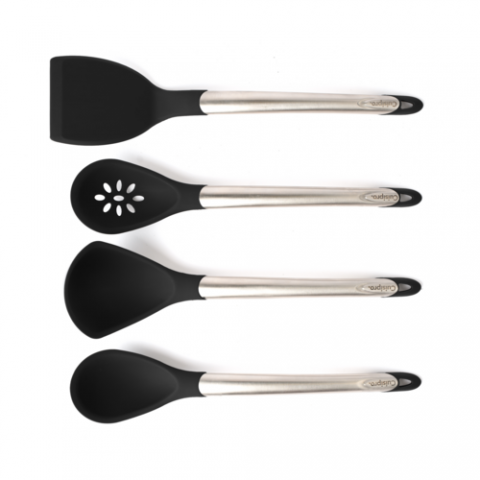 CUISIPRO Tool Set, 12.6" L X 3.94" W X 3.15" H, Includes: Ladle, Turner, Spoon & Slotted Spoon, Black, Heat resistant up to 425 F/220 C, odor resistant, stain resistant, black silicone heads, ergonomic stainless steel handle, dishwasher safe