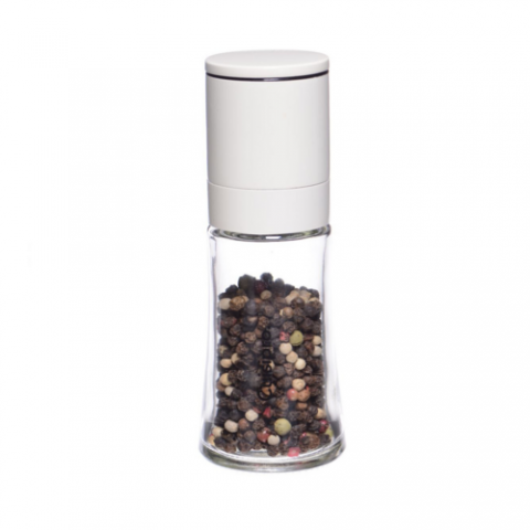 CUISIPRO Grinder White 5.25"/13.5cm, 2" L X 2" W X 5" H / 65ml/2.29oz, Ceramic grinding mechanism, glass container with stainless steel shaft, snap on/off cap, four grinding levels, wipe to clean