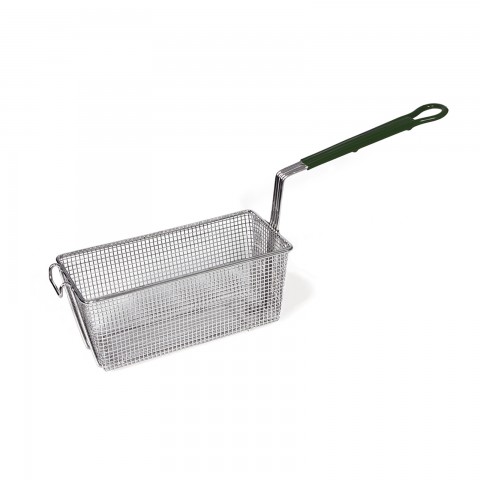 Fry Basket, 13"x 6.5"x 5"/ 33.0x 16.5x 12.7cm, rectangular, green handle, single wire construction, nickel-plated