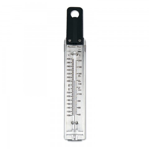 Candy/Jelly/Deep Fry Thermometer, 4-7/8"W x 1-1/4"H, temperature range 100° to 400° F (35° to 205° C), accuracy +/-1° F, dual face, glass mercury filled, heat-resistant handle, dishwasher safe (item may be prohibited in certain U.S. states)