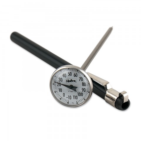 Pocket Test Thermometer, 1" dial, 5"L, temperature range -10° to 110° C, accuracy of +/-1° F, bezel & pointed stem, storage case with pocket clip, NSF (not for oven use)