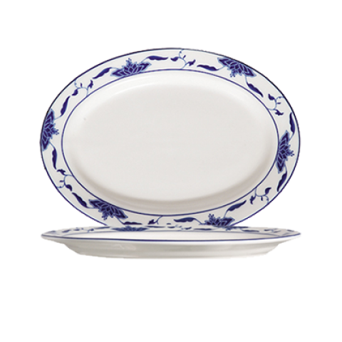 Blue Lotus Platter, 12-1/4"L x 8-3/4"W x 1-1/4"H, oval, rolled edge, dishwasher, oven and microwave safe, porcelain, Blue/Bone White (Sold by case)
