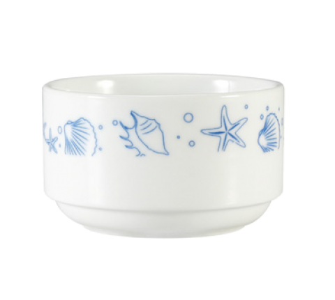 Atlantic Seashell Bouillon Cup, 12 oz., 4" dia. x 2-3/8"H, round, stacking, dishwasher, oven, and microwave safe, porcelain, Blue decorated Rim/Super White (Sold by case)