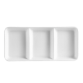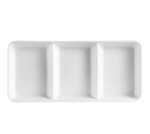CN Divided Side Dish Plate, 6 oz., per compartment, 12-1/2"L x 5-1/2"W x 1-1/8"H, rectangular, 3-compartments, dishwasher, oven and microwave safe, porcelain, Super White (Sold by case)