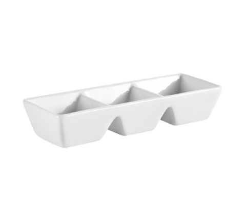 CN Divided Side Dish Plate, 1-1/2 oz. per compartment, 7"L x 2-1/2"W x 1-1/4"H, rectangular, 3-compartments, dishwasher, oven and microwave safe, porcelain, Super White (Sold by case)