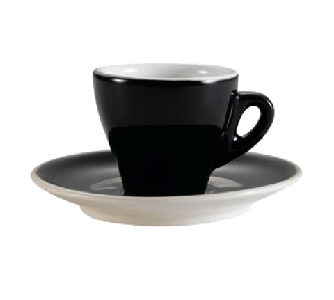 Cup and Saucer Set, 2-piece, includes: (1) 3-1/2 oz., 2-3/4" dia. x 2-3/8"H cup and (1) 4-7/8" dia. x 3/4"H, round saucer, dishwasher, oven and microwave safe, porcelain, Black/Super White (Sold by case)