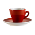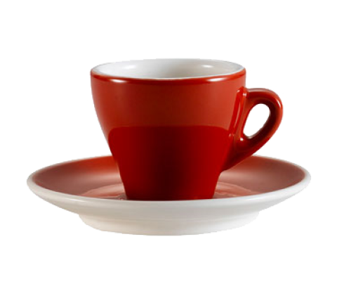 Cup and Saucer Set, 2-piece, includes: (1) 3-1/2 oz., 2-3/4" dia. x 2-3/8"H cup and (1) 4-7/8" dia. x 3/4"H, round saucer, dishwasher, oven and microwave safe, porcelain, Red/Super White (Sold by case)