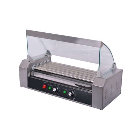 Hot Dog Grill, (5) rollers, (12) hot dog capacity, sneeze guard, & removable drip tray, (2) independent thermostatic heat controls (front & rear), sealed roller ends, stainless steel construction, non-skid rubber feet, 110v/60/1-ph, 700 watts, cord, NEMA 5-15P, cETLus, ETL (Qty Break = 1 set)