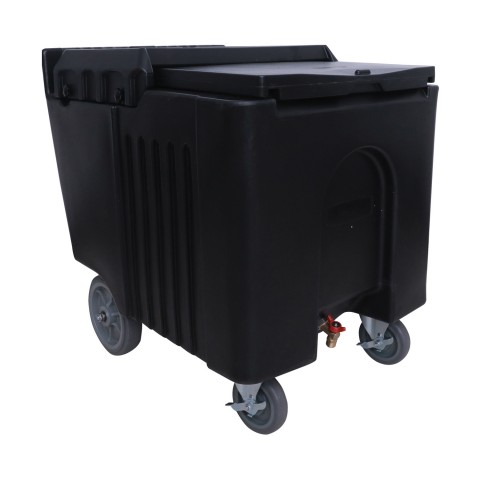 Ice Caddy, mobile, 31-1/2"L x 23"W x 29-3/8"H, 126 lb. capacity, up to 4 hour cold retention, sliding cover, polyurethane foam insulation, built-in faucet & water tank, for indoor/outdoor use, no assembly required, (4) non-marking casters (2) with brakes, black, NSF (ships by freight only, UPS small package is not available) (Qty Break = 1 set)
