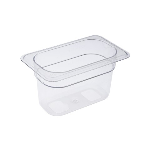 Food Pan, 1/9-size, 4" deep, rounded corners, with smooth non-stick interior, shatter and scratch resistance, dishwasher and freezer safe, temperature resistance between -40 to 210°F polycarbonate, clear, NSF (QTY break = 12 each)