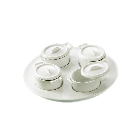 Gourmet Collection Tray and Jar Set, includes: (4) 3 oz., 4"L x 3"W x 2-1/4"H, oval jars, with (4) lids and (1) 9-1/2" dia. x 1/2"H, round tray, dishwasher, oven and microwave safe, porcelain, Super White (Sold by case)