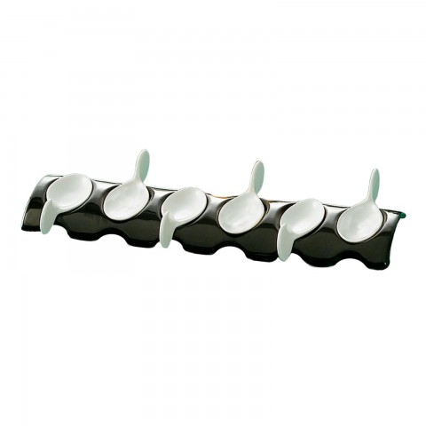Party Collection Tasting Spoon Set, includes: (6) 4"L x 1-1/2"W x 1-1/4"H, oval tasting spoons and (1) 12-1/2"L x 3-1/2"W x 1"H, rectangular tray, dishwasher, oven and microwave safe, porcelain, Black/Super White (Sold by case)