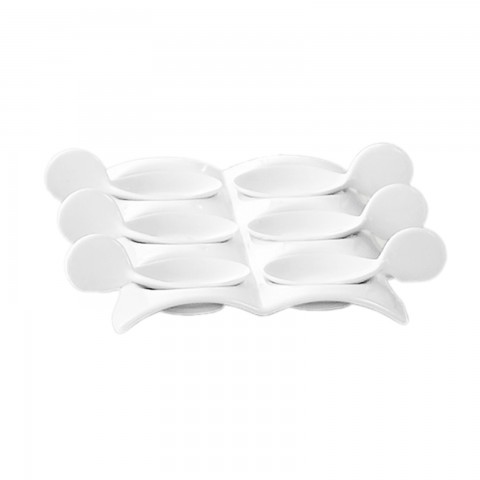 Party Collection Tasting Spoon Set, includes: (6) 4"L x 1-1/2"W x 1-1/4"H spoons and (1) 8-1/2"L x 7"W x 3/4"H, rectangular tray, dishwasher, oven and microwave safe, porcelain, Super White (Sold by case)