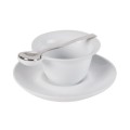 Party Collection Cup and Saucer Set, includes: (1) 7 oz., 5-1/4"L x 4-1/8"W x 2-3/8"H cup, (1) 6-1/4" dia. x 1"H saucer and (1) metal spoon, dishwasher, oven and microwave safe, porcelain, Super White (Sold by case)