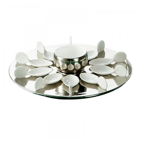 Party Collection Tasting Spoon Set, includes: (10) 4"L x 1-1/2"W x 1-1/4"H tasting spoons, (1) 7 oz., 3-1/2" dia. x 2"H bowl and (1) 12-1/4" dia. x 1/2"H, round tray, dishwasher, oven and microwave safe, porcelain, Silver/Super White (Sold by case)